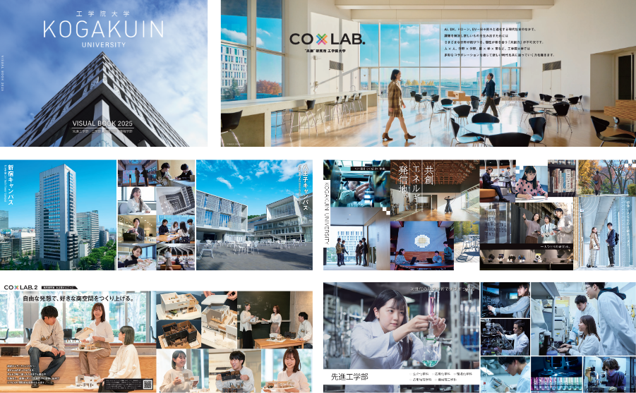 写真主体の誌面構成により、理工系ならではの学びや研究の風景を臨場感あふれるビジュアルで表現。A4・横長の写真集風の冊子として制作されており、学生が真摯なまなざしで学びに挑む姿を映し、工学院大学の「共創で向き合う場」のでの学びを表現しています。さらに、高校教員をはじめとする重要なステークホルダー向けの最新・定量情報も併記し、信頼性の向上も図っています。